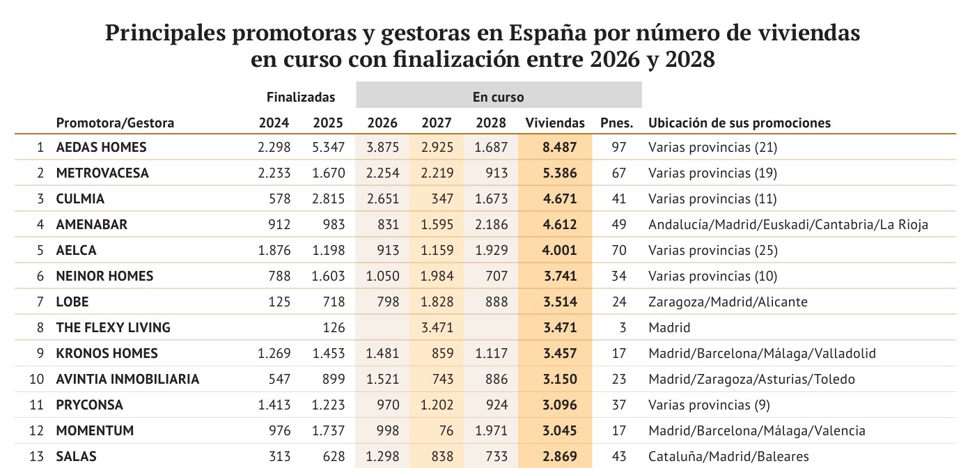 De las más de 800 empresas analizadas en el informe que operan en España, Grupo SALAS ocupa la posición 13 en el ranking estatal de producción de vivienda, con 2.869 viviendas en curso previstas para entrega entre 2026 y 2028, lo que refleja su crecimiento sostenido y una sólida implantación en el mercado residencial español.